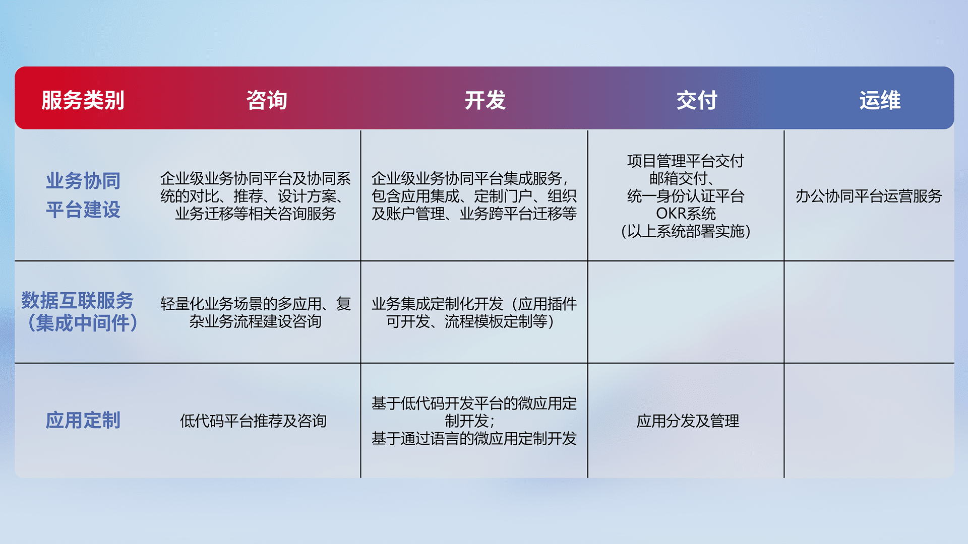 针对钉钉、、、企微、、、、IDaas等平台级产品提供产品的规划、、方案、、交付、、、定制化开发等服务,,,实现如统一协同办公、、、智能客户服务、、、混合会议管理、、智能数据查询、、等业务场景,,,实现数字化转型。。。