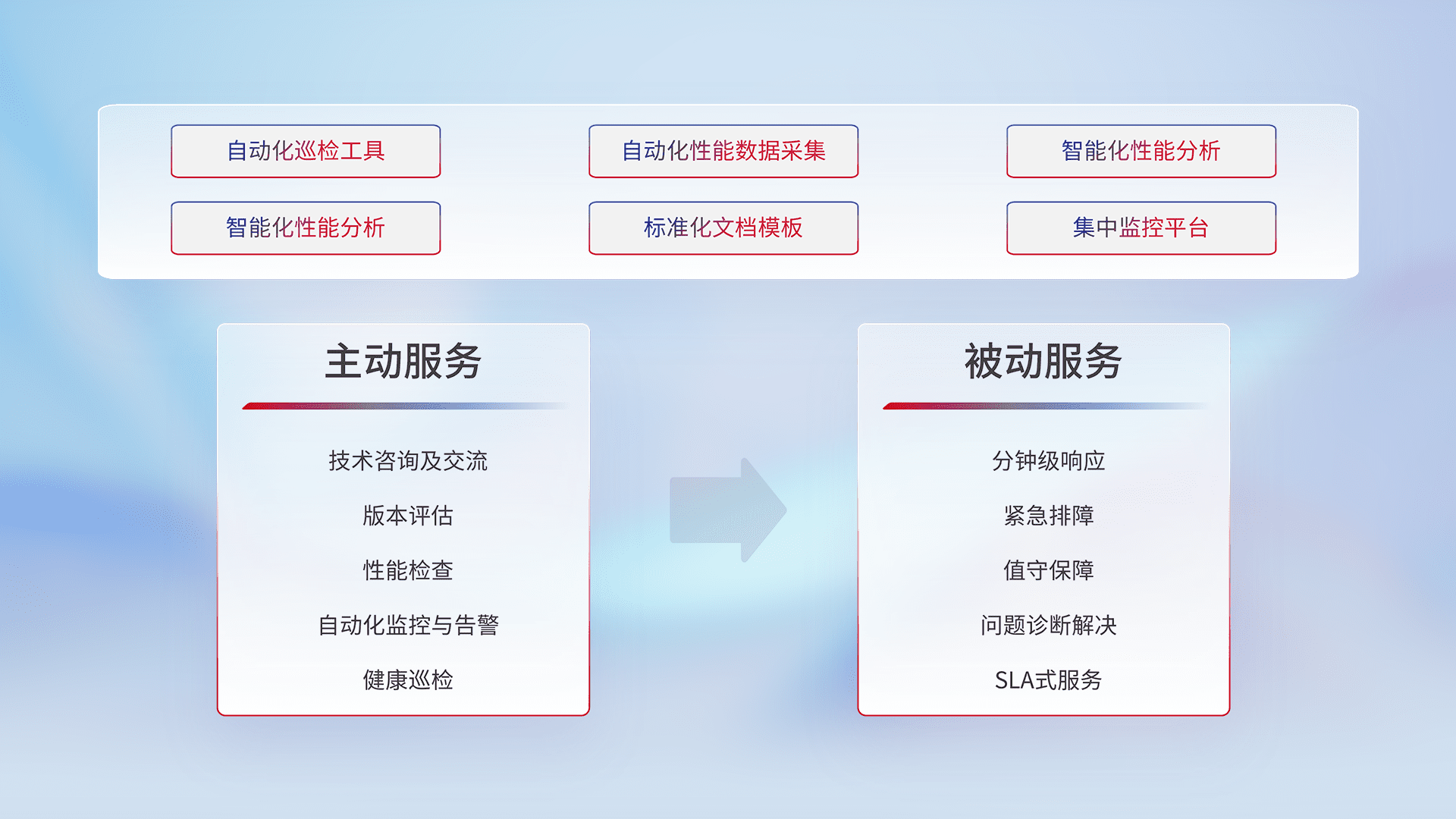 智能化工具和标准化文档,,,,保障服务质量,,,提供主动服务(包含技术咨询、、、版本评估、、、性能检查、、、自动化监控与告警、、、、健康巡检)和被动服务包含(分钟级响应、、、紧急排障、、、值守保障、、问题诊断解决、、、、SLA服务)。。