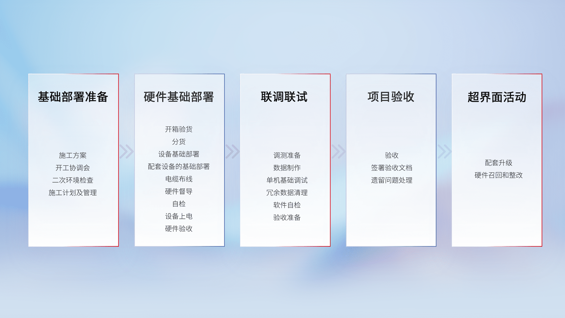 从基础部署准备、、、、硬件基础部署、、联调联试、、、项目验收、、越界面活动的全过程可追溯,,保证施工质量和进度。。。。